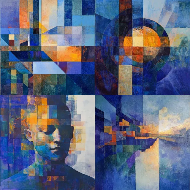 В этих произведениях искусства доминирует смелая геометрическая абстракция. Они характеризуются мозаикой угловатых форм и яркими цветовыми контрастами. Использование синего и оранжевого создаёт динамичное взаимодействие между холодными и тёплыми тонами, усиливая визуальную глубину и сложность.