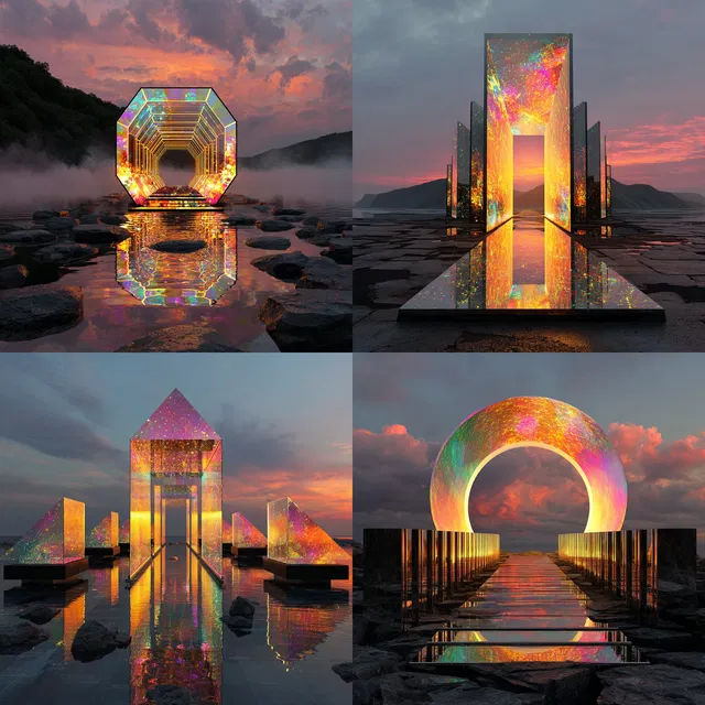 В оформлении преобладают отражающие поверхности и призматическое освещение, что создаёт неземную и сюрреалистичную атмосферу. Переливающиеся текстуры и полупрозрачные элементы усиливают сказочность, а светящиеся блики добавляют глубины.