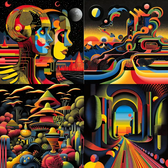 Яркие основные цвета и высокая насыщенность создают энергичную палитру, а многослойные текстуры и оптические иллюзии добавляют глубины.