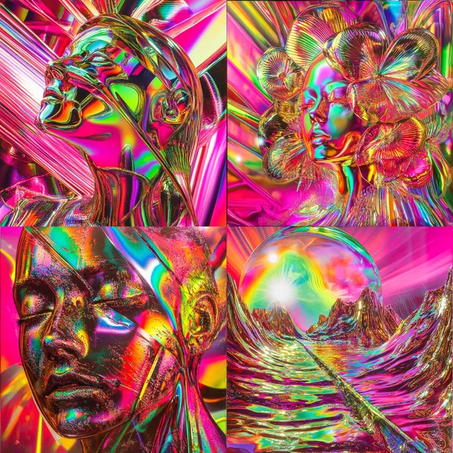 Этот стиль определяют взрывная переливчатость и динамичные формы, в которых зеркальные поверхности сочетаются с яркими неоновыми оттенками. Он создаёт сюрреалистичную и сказочную атмосферу, передавая футуристическую суть через голографические текстуры и сложные композиции.