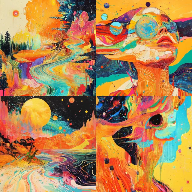 Использование цвета и динамичных форм здесь преобладает и носит взрывной характер, создавая яркий и энергичный визуальный язык. Стиль процветает за счёт абстрактного экспрессионизма, объединяя психоделические влияния с современными художественными течениями. Его текучая динамика и закрученные мотивы вызывают ощущение движения и жизненной силы.