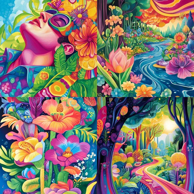 Этот стиль поражает яркими красками и динамичными композициями. Он очаровывает своим игривым и причудливым подходом. Насыщенные оттенки и смелые контрасты создают живое визуальное впечатление, напоминающее психоделическое искусство и поп-культуру.