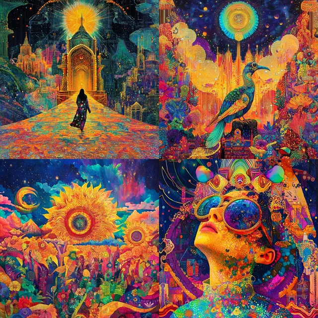Этот стиль поражает своей взрывной яркостью и замысловатыми деталями. Он завораживает психоделической и визионерской эстетикой. Светящиеся цвета и витиеватые узоры создают сюрреалистичную, сказочную атмосферу, напоминающую одновременно роскошь Густава Климта и дерзость Яёи Кусамы.