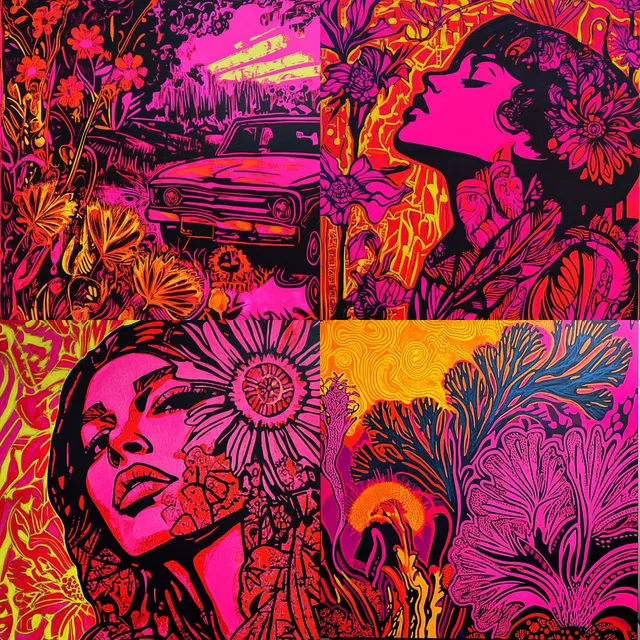 Психоделический неоновый фьюжн завораживает своей яркой палитрой и смелыми цветами, создавая визуально электризующий эффект. Психоделические узоры и закрученные линии этого стиля вызывают ощущение текучего движения и энергичного потока. Влияние поп-арта и эстетика 1960-х годов сливаются с современной абстракцией, образуя уникальное сочетание ретрофутуризма и сюрреализма.