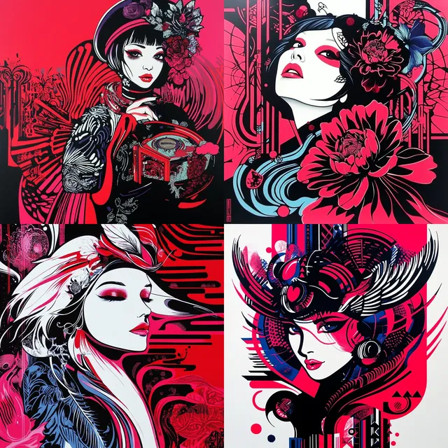 Этот стиль отличается яркой стилизацией с жирными контурами и высоким контрастом. Он объединяет элегантность ар-нуво с психоделической яркостью. Его графичность проявляется в плоских цветах и замысловатых узорах, создавая динамичное визуальное впечатление.