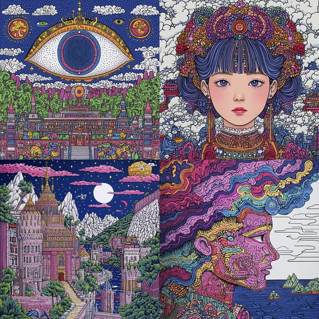 Этот стиль отличается замысловатостью и яркостью. Для него характерны сложные, детальные композиции, вдохновлённые ар-нуво и психоделикой. Благодаря насыщенной, красочной палитре этот стиль создаёт динамичные, фактурные изображения, одновременно витиеватые и живые.