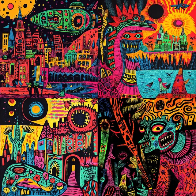 Этот стиль отлично подходит для изображения причудливых и сюрреалистичных миров. Он часто заимствует культурные мотивы и традиционные узоры, особенно мексиканские и латиноамериканские.