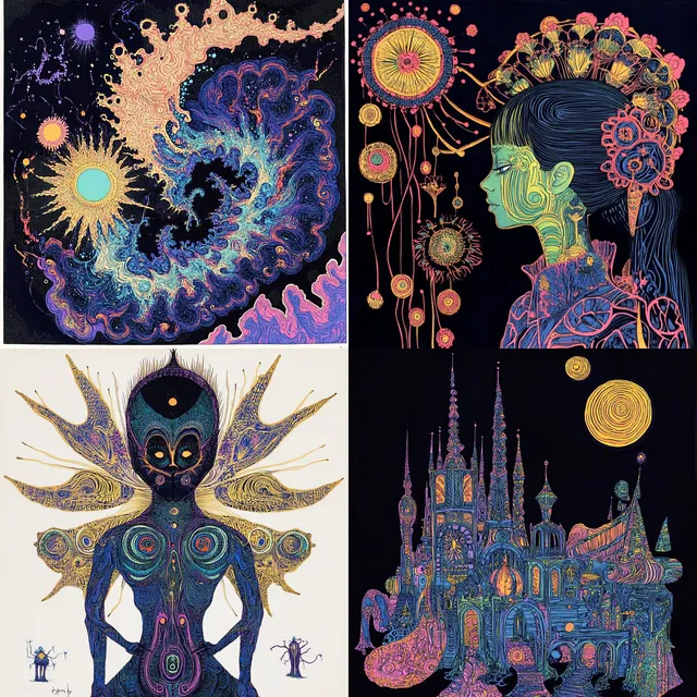 Стиль отличается яркими и замысловатыми узорами, богатыми деталями. Он изобилует психоделическими мотивами и сюрреалистичными формами. Композиции в этом стиле сложные, часто напоминают эстетику ар-нуво и контркультуры 1960-х годов. Космические пейзажи и мифические существа населяют его сказочные декорации, создавая сюжеты, которые исследуют фантастику и мистику.