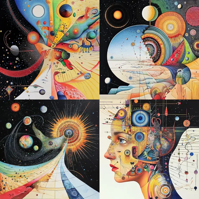 Космическая сложность завораживает своей детальной проработкой и яркими цветами, создавая сюрреалистичную атмосферу, которая ощущается одновременно футуристичной и потусторонней. Этот стиль превосходно изображает космические мотивы и геометрические узоры, предлагая динамичные композиции, которые вызывают ощущение исследования и открытия. Хотя он отлично подходит для творческих и абстрактных контекстов, ему может быть сложно справиться с фотореализмом или более простыми задачами дизайна, что ограничивает его универсальность в более традиционных или прямолинейных приложениях.