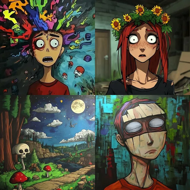 Яркие цвета и смелые контуры определяют этот стиль, сочетая сюрреализм с причудливой, мультяшной эстетикой. Насыщенные текстуры и многослойные композиции создают атмосферу мечты, а игра света и тени добавляет глубины. Постоянно выразительный и преувеличенный, этот стиль отлично подходит для изображения эксцентричных персонажей и фантастических пейзажей. Его сильные стороны — графические романы, анимация и концепт-арт, хотя ему может не хватать реализма в фотореалистичных контекстах. Идеален для проектов, требующих игривого, но сложного визуального повествования.