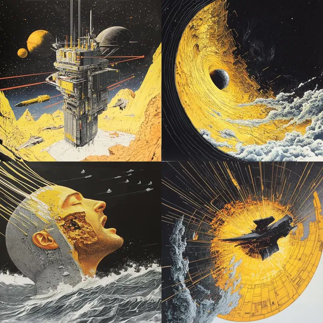 Использование яркого жёлтого и контрастного чёрного цвета создаёт высококонтрастную визуальную историю, подчёркивая темы будущего и технологий. Замысловатые линии и геометрическая точность подчёркивают сложные конструкции и космическое окружение. Этот стиль превосходно подходит для изображения научной фантастики, сочетая элементы ретрофутуризма с современным дизайном. Однако ему может не хватать тонкости в более мягких и органических сценах, поскольку он в значительной степени опирается на свою структурированную и яркую эстетику. Идеален для научно-фантастических и технологических приложений, но менее подходит для натуралистичного или эмоционального повествования.