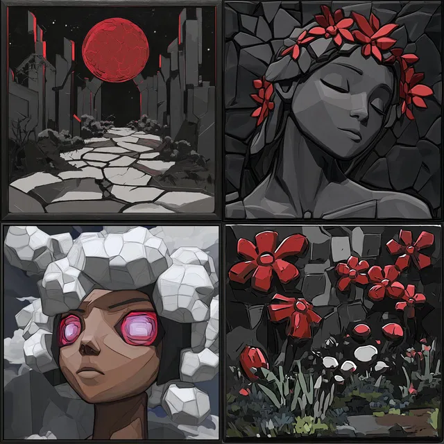 Стиль отлично подходит для создания высококонтрастных, графических иллюстраций, в которых сочетаются футуристические и мифологические темы. Геометрическая абстракция и отражающие поверхности добавляют глубины, а светотеневое освещение усиливает настроение и драматизм.