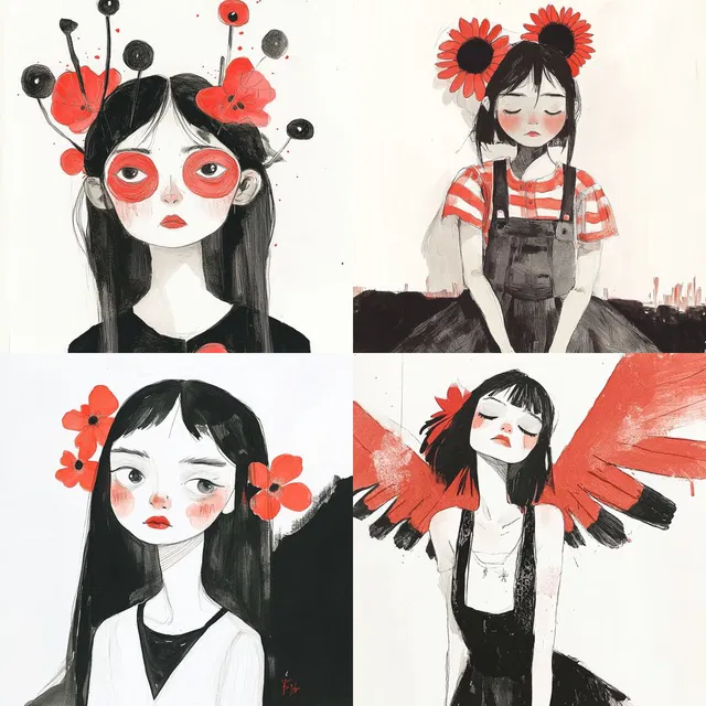 В работах «Monochrome Whimsy» используется строгая чёрно-белая палитра с яркими акцентами красного цвета, что создаёт выразительный и визуально эффектный стиль. Иллюстрации отличаются минималистичным подходом, напоминающим наброски, часто включают стилизованных персонажей и причудливые элементы.