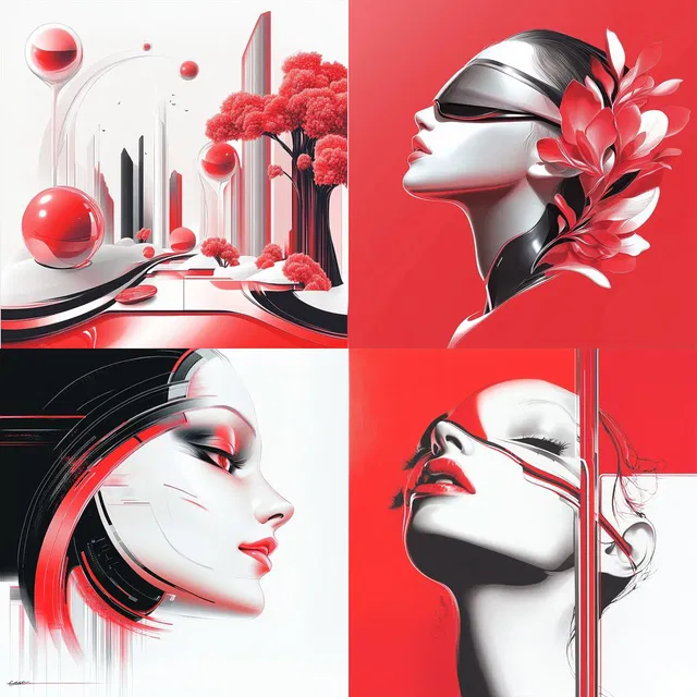 Активное использование монохромных палитр, преимущественно красного и чёрного цветов, создаёт яркий визуальный эффект. Стиль прекрасно подходит для изображения футуристических тем с помощью изящных геометрических форм и высококонтрастных композиций. Отражающие поверхности и плавные градиенты усиливают современную эстетику, а динамичные линии намекают на движение и прогресс.