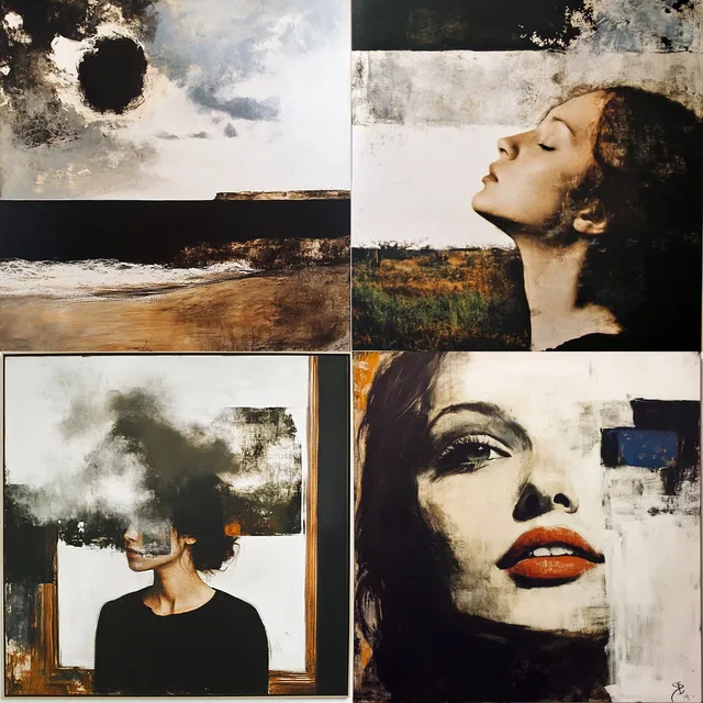 Использование приглушённых тонов и натуральных палитр наполняет каждое произведение ностальгией и побуждает к самоанализу, а сложное наложение текстур добавляет глубины и сложности.