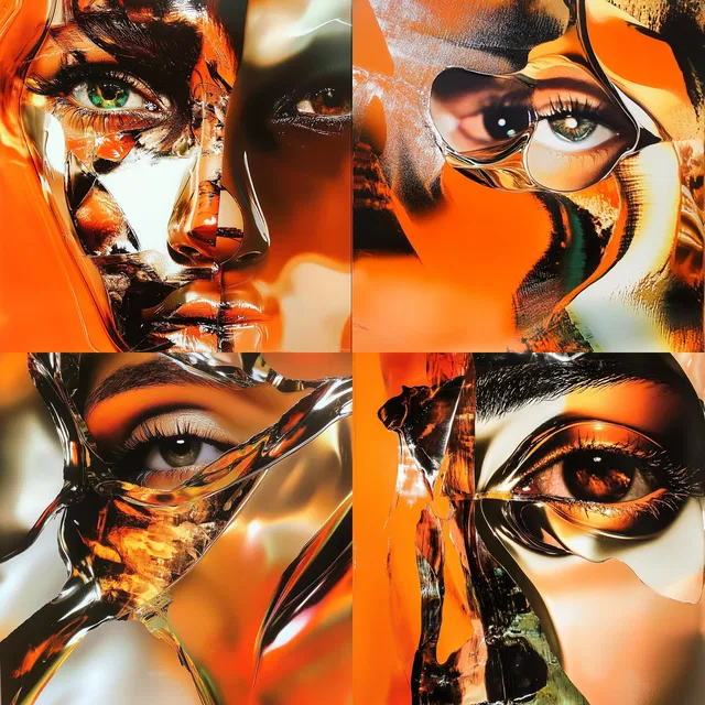 Преобладают отражающие поверхности, которые создают сюрреалистичную и сказочную атмосферу. Яркая оранжевая и блестящая хромовая палитра придаёт каждому изделию футуристический оттенок, а плавные формы и зеркальные элементы добавляют динамичности и современности. Этот стиль прекрасно передаёт авангардную эстетику, что делает его идеальным для модных редакций и современной архитектуры. Однако его зависимость от искажений при отражении может ограничить универсальность в более традиционном или фотореалистичном контексте.