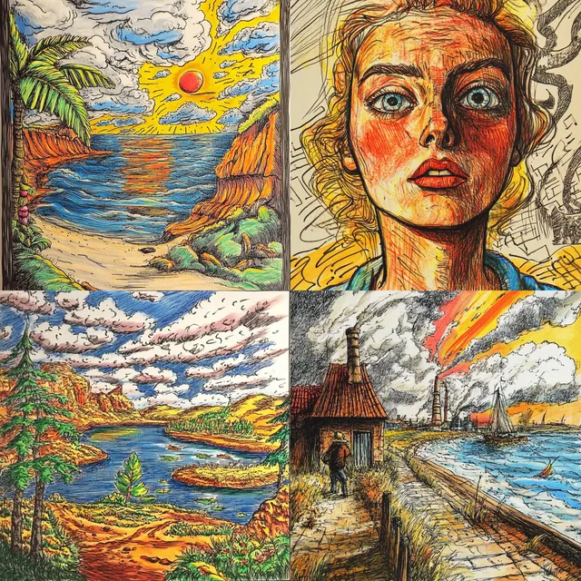 Доминируют яркие цвета и смелые контуры, создавая живое и причудливое визуальное впечатление. Замысловатые линии и динамичные композиции наполняют энергией каждое произведение, а детальные текстуры и игривые тона придают глубину и очарование.