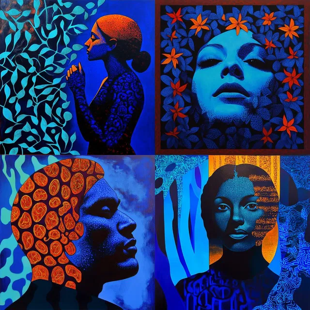 Этот стиль характеризуется яркими контрастами и чёткими линиями, что создаёт динамичное взаимодействие между насыщенным синим и оранжевым цветами. Выразительные контуры и фактурные поверхности вызывают ощущение ретрофутуризма, вдохновлённого оп-артом и психоделическими течениями.