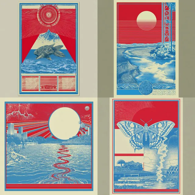 Этот стиль отличает поразительное сочетание ярких красных и синих оттенков, создающее смелые контрасты и динамичные композиции. Заметны сложные техники гравировки и детальная проработка линий, что придаёт каждому произведению точность и сложность.