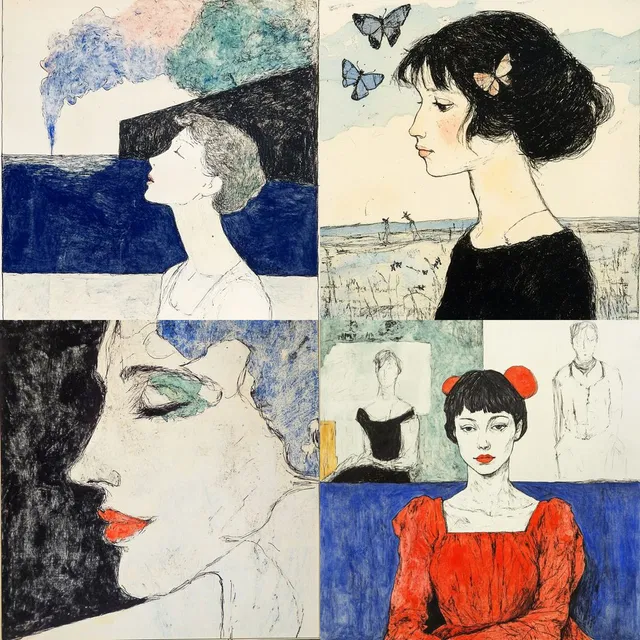В этом стиле преобладают выразительные линии и приглушённые цветовые палитры, что создаёт ностальгическую, но в то же время современную эстетику. Использование чётких контуров и нежных текстур подчёркивает человеческие фигуры и абстрактные формы, а минималистичный подход в оформлении элементов добавляет структурированную элегантность.