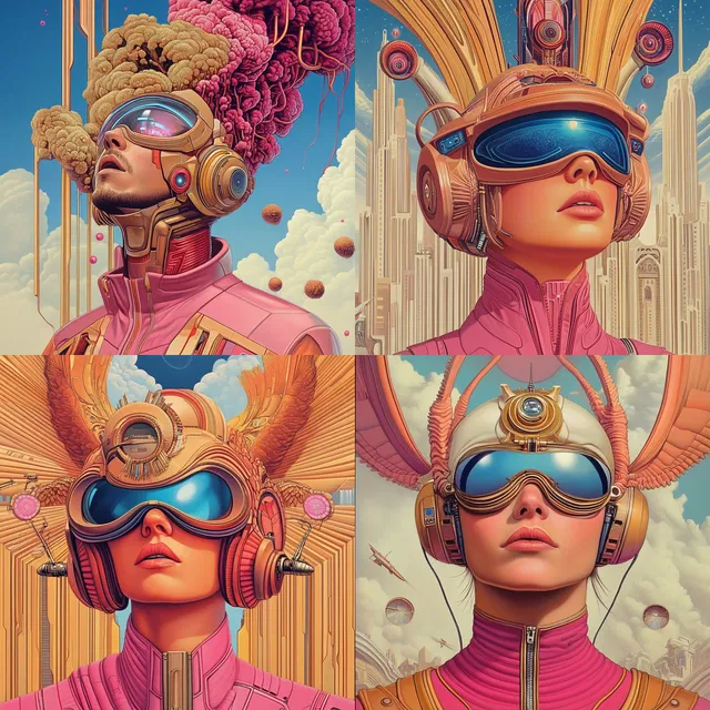 Этот яркий футуристический стиль отличается сложными деталями и насыщенными цветовыми палитрами, создавая динамичное взаимодействие между ретрофутуризмом и эстетикой современного научной фантастики.