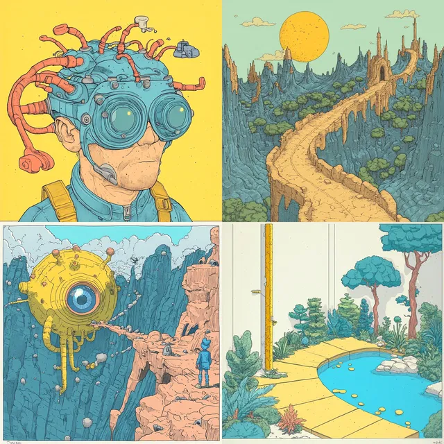Этот стиль отличается чёткими контурами и плоской цветовой палитрой. Он вызывает ощущение ретрофутуристической причудливости, напоминающей комиксы середины XX века. В нём прекрасно получаются сюрреалистические пейзажи и стилизованные персонажи. Яркие контрастные цвета усиливают игривые и творческие темы.