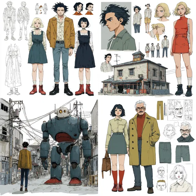 Этот стиль отличается сложными деталями и выразительными линиями, в которых сочетаются элементы манги и эстетика ретрофутуризма. Приглушённая цветовая палитра и фактурные поверхности создают ностальгическую атмосферу, а динамичные композиции и многослойность усиливают визуальное повествование.