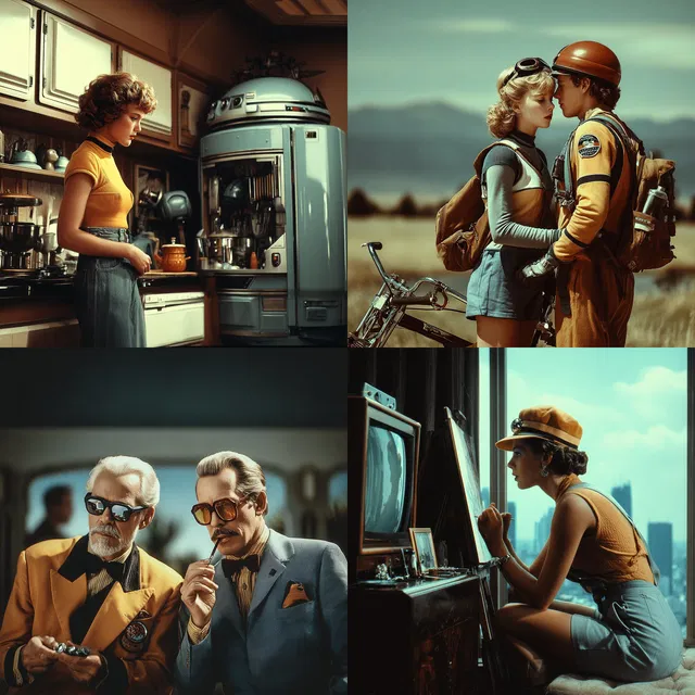 Ностальгическое тепло пронизывает каждое визуальное повествование, передавая суть эстетики середины XX века с налётом космической эры. Приглушённые тона и мягкое освещение создают вневременное очарование, а ретрофутуристические дизайны органично сочетаются с классическими американскими мотивами.