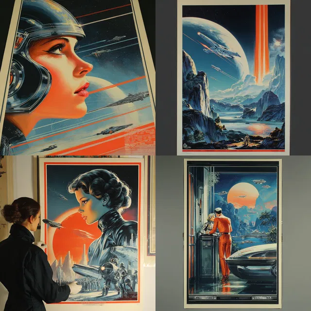 В этом стиле преобладают яркие цветовые контрасты и выразительные палитры, которые создают смелый визуальный образ, объединяющий ретрофутуризм с научно-фантастической культурой.