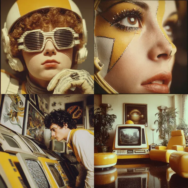 Этот стиль отлично подходит для создания кинематографической атмосферы с мягким фокусом и зернистыми текстурами, напоминающими аналоговую фотографию. Он передаёт причудливое и игривое настроение, часто сочетая футуристические и научно-фантастические элементы с ретро-нотками.