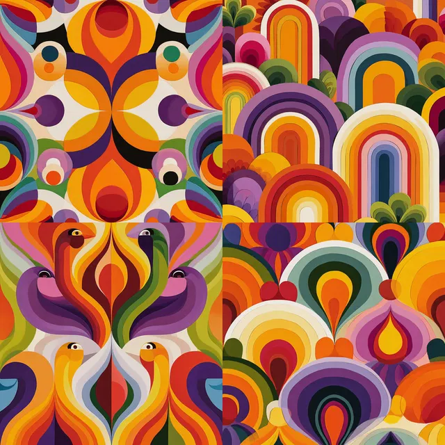 Яркие цвета и смелые геометрические узоры определяют этот стиль, напоминающий оп-арт 1960-х годов и психоделическую эстетику. Использование концентрических кругов, наложенных друг на друга дуг и фигур создаёт динамичный визуальный ритм, а палитра ретро-цветов вызывает ощущение ностальгии.