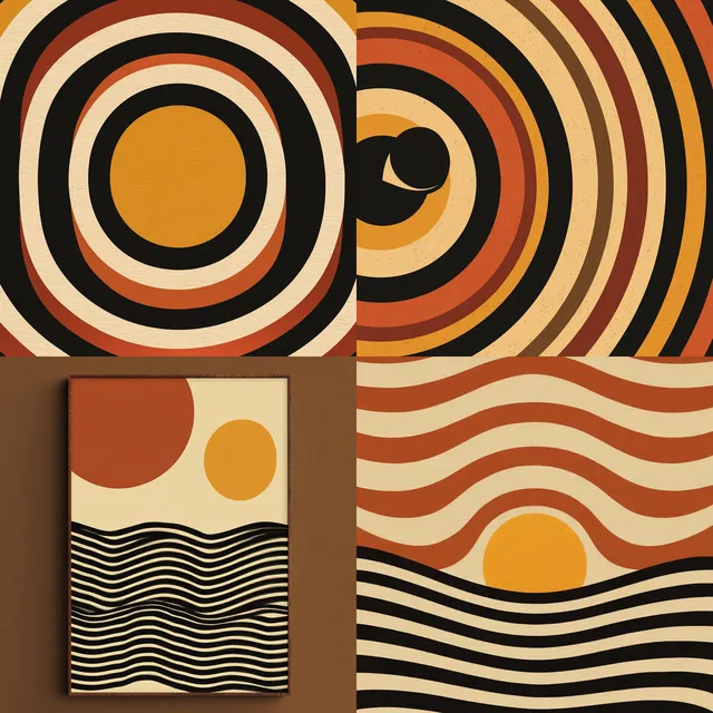 Этот стиль характеризуется тёплыми, землистыми тонами и графической простотой. Он вызывает ощущение ностальгического тепла и очарования ретро. Элегантность минимализма выражается через смелые геометрические узоры и упрощённые формы, напоминающие о влиянии стиля середины XX века и Баухауса.
