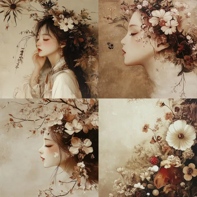 Тоны сепии и тёплые пастельные оттенки придают изображениям ностальгическое, винтажное ощущение, напоминая об искусстве ар-нуво и романтизме. Замысловатые цветочные мотивы и органические текстуры переплетаются в каждом элементе, создавая гармоничное сочетание природы и искусства.