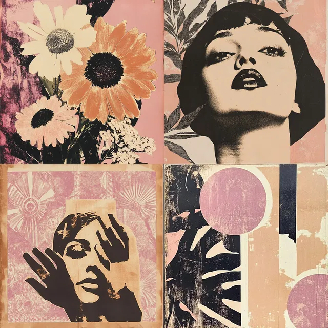 Этот стиль — удивительное сочетание ретро-эстетики и влияния поп-арта. Он завораживает своими визуалами, напоминающими коллажи, и текстурированными поверхностями. В цветовой палитре преобладают приглушённые розовые и мягкие пастельные тона, что создаёт ностальгическую атмосферу, которая пронизывает каждое произведение.