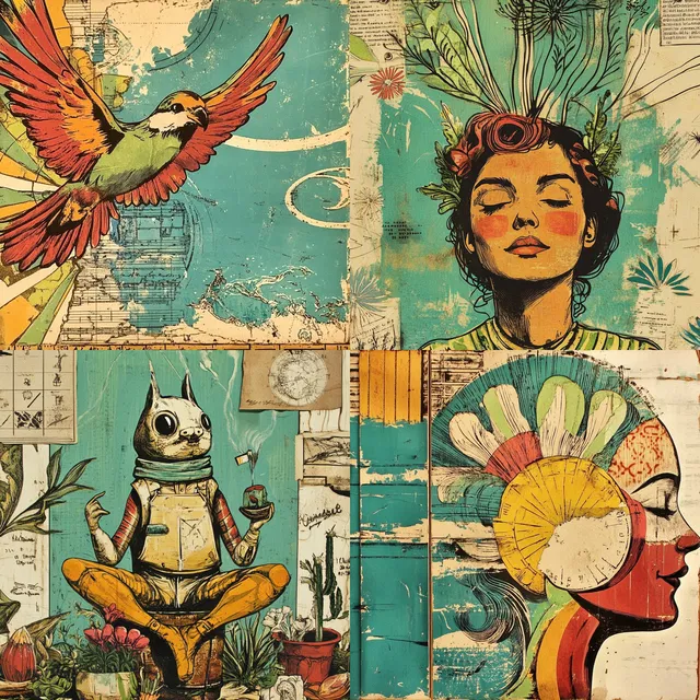 Яркие цвета и чёткие контуры определяют этот стиль, вызывая ощущение ретро-ностальгии и игривой причудливости. Использование изношенных текстур и многослойных композиций создаёт богатую визуальную глубину, напоминающую влияние поп-арта середины XX века.
