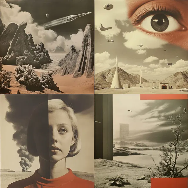 Ретрофутуристические пейзажи сочетают эстетику середины XX века с элементами сюрреализма, создавая ностальгическую, но в то же время провидческую атмосферу. Тона сепии и приглушённые цвета вызывают ощущение вневременности, а геометрическая точность и минималистичные элементы придают чистый, обтекаемый вид.
