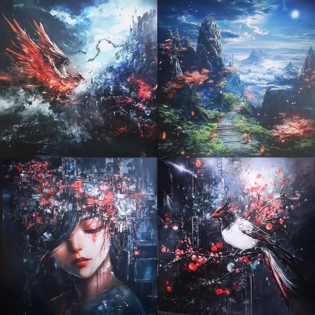 Этот стиль поражает сочетанием футуристических и фантастических элементов. Он завораживает яркими контрастами и выразительным динамизмом. В цветовой палитре преобладают неоново-красный и электрический синий, создавая светящуюся и яркую атмосферу. Замысловатые детали и текстурное богатство придают глубину и сложность каждой композиции, будь то кибернетические персонажи или заколдованные пейзажи.