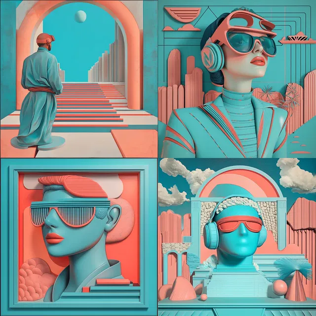 Преобладает устойчивая сине-бирюзовая и коралловая палитра. Стиль создаёт уникальный визуальный язык, в котором звучат отголоски конструктивизма и Баухауса.