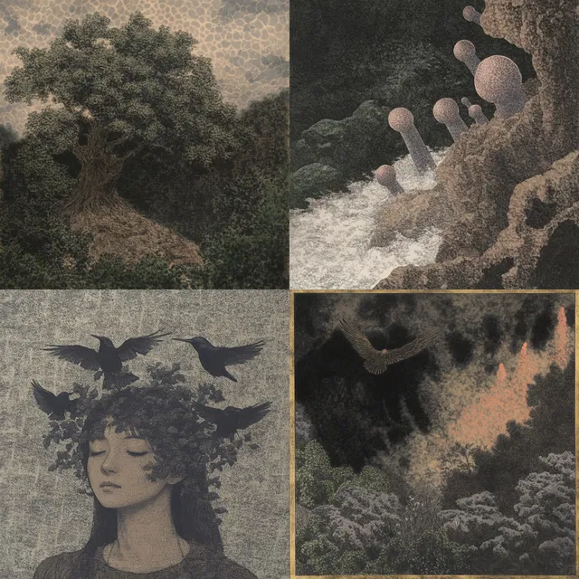 Текстурная насыщенность и многослойность композиций определяют этот стиль, вызывая ощущение вневременности и глубины. Тонкие градиенты и сложные детали создают живописность, напоминающую символизм и модерн. Приглушённые тона и земляные цвета способствуют созданию безмятежной и спокойной атмосферы, а мягкий фокус и нежные выражения на портретах добавляют интимности. Несмотря на сильные стороны этого стиля в плане художественной глубины и визуального повествования, ему может не хватать фотореализма или динамичных 3D-эффектов. Этот стиль идеально подходит для книжной иллюстрации, редакционного дизайна и концепт-арта. В этих направлениях он превосходно создаёт атмосферные и насыщенные сюжетом визуальные образы.