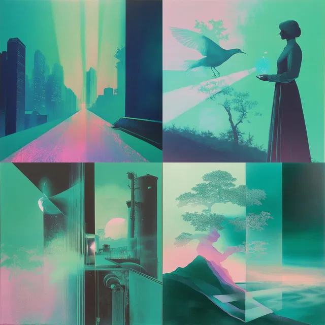 В этом футуристическом стиле преобладают яркие неоновые оттенки, которые сочетают в себе эфемерные пейзажи и абстрактные геометрические формы. Игра света и тени создаёт сюрреалистичную, сказочную атмосферу, вызывая ощущение исследования потустороннего мира.