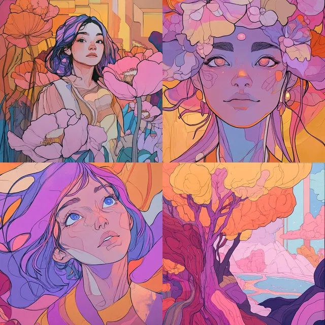 Этот стиль определяют яркие пастельные градиенты и выразительные линии, в которых переплетаются влияние стиля ар-нуво и современный шик. Органичные изгибы и динамичные контуры создают атмосферу мечты, а многослойные композиции добавляют глубины и сложности.