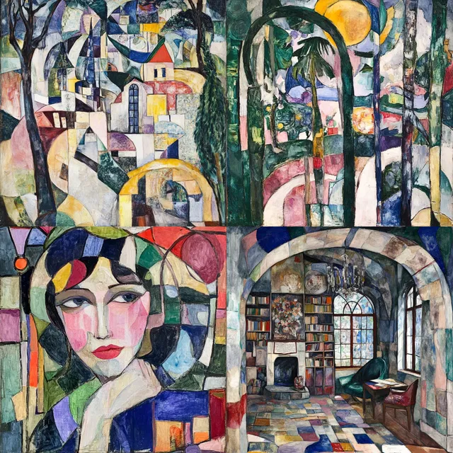 В этом стиле преобладает геометрическая абстракция: яркие цвета и многослойные композиции создают динамичный визуальный язык. Влияние кубизма проявляется в угловатых формах и смелых оттенках, предлагая модернистский взгляд на традиционные темы.