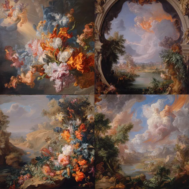 Этот стиль — пышный и выразительный. Он вобрал в себя витиеватую элегантность влияний рококо и барокко, для которых характерны яркие цвета и замысловатые детали. Композиции насыщены плавными мазками кисти и динамикой, создающими причудливую и сказочную атмосферу.