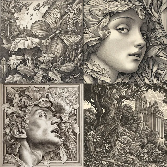 Монохромная палитра, часто с оттенками сепии, вызывает чувство ностальгии и вневременности. Богато украшенные элементы и роскошные образы создают ощущение пышности.