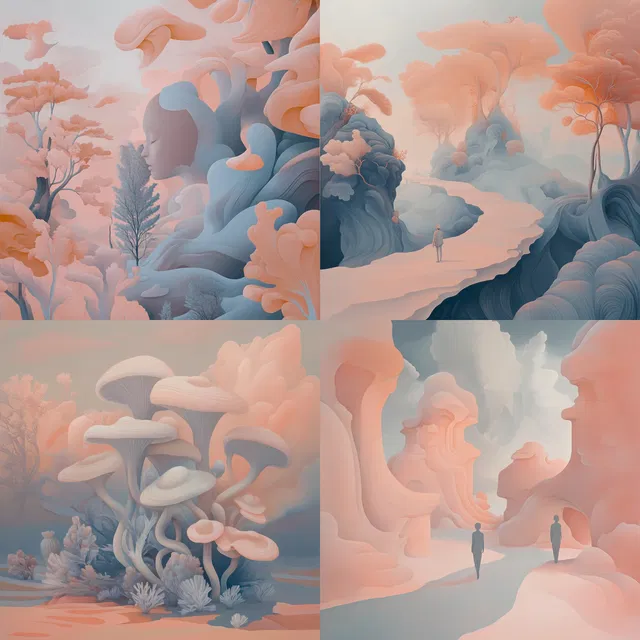 Этот стиль завораживает своей пастельной палитрой и плавными формами. Мягкие переходы и естественные очертания создают безмятежную атмосферу, которая одновременно успокаивает и кажется нереальной. Использование плавных изгибов и призрачного освещения усиливает ощущение чего-то сказочного, что делает стиль идеальным для концепт-арта, фантазийных иллюстраций и fashion-дизайна.