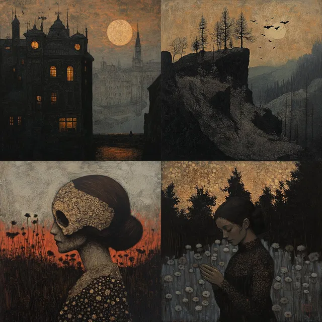 Эфирный и атмосферный стиль передаёт суть символизма и романтизма при помощи приглушённых тонов и замысловатых деталей. В композициях преобладают готические силуэты и меланхоличные фигуры, создавая сказочное повествование, которое перекликается с историческими и мистическими темами. Текстурное богатство и многослойность добавляют тактильные качества, усиливая визуальное повествование.
