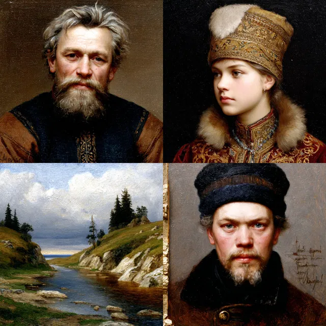 Этот стиль отличается детальной проработкой и исторической достоверностью. Он прекрасно передаёт суть русского искусства XIX века. В нём мастерски сочетаются текстурное богатство и эмоциональная глубина, создавая сложную повествовательную структуру, которая перекликается с культурными и историческими темами.