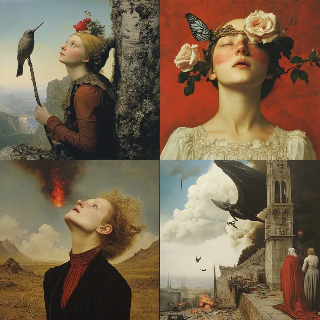 Этот стиль представляет собой завораживающее сочетание сюрреализма и классических художественных техник. Он объединяет детальный реализм с элементами фантазии. В композициях часто можно увидеть детально прорисованные фигуры и пейзажи, напоминающие искусство эпохи Возрождения и барокко, но с современным сюрреалистическим уклоном.