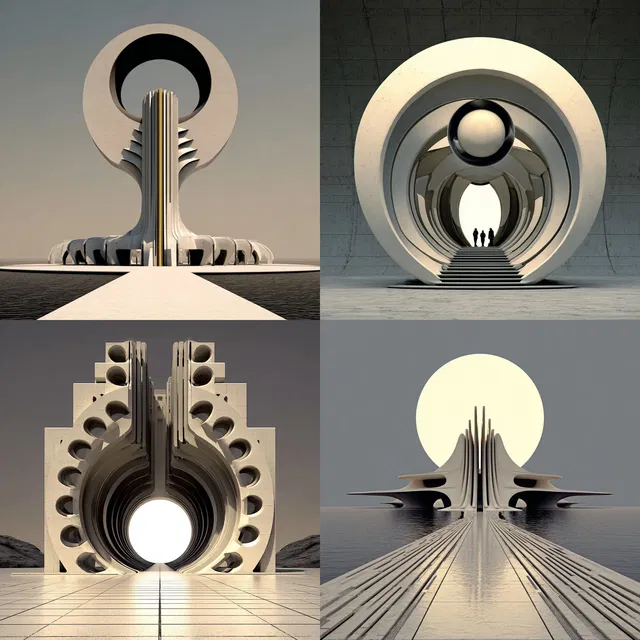 Этот стиль отличается скульптурными формами и монументальными композициями. В его основе — геометрическая абстракция и футуристическая эстетика. Он использует минимализм в монохромной и сдержанной палитре, чтобы создать ощущение величия и изысканности. Замысловатые детали и структурная точность напоминают модернистские и конструктивистские влияния, проводя параллели с работами Захи Хадид и Сантьяго Калатравы.