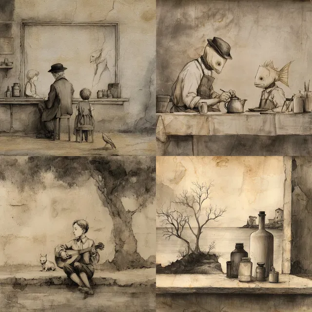 В работах преобладают тона сепии и тёплые оттенки, создающие ностальгическую и винтажную атмосферу. Тонкие линии и изящные мазки добавляют текстурную глубину и богатство поверхности, усиливая повествовательный фокус и элементы рассказывания историй.